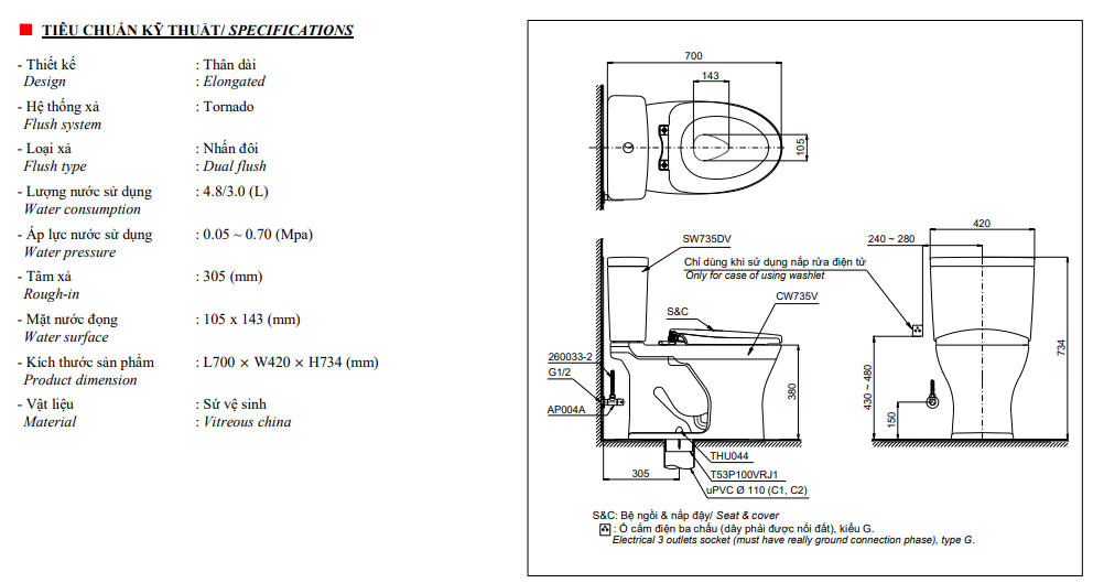 • Hệ thống xả xoáy Tornado siêu mạnh, siêu êm, tiết kiệm nước